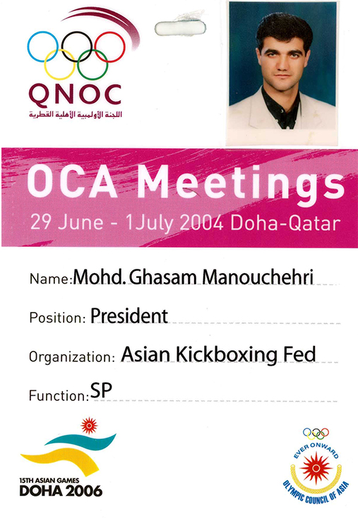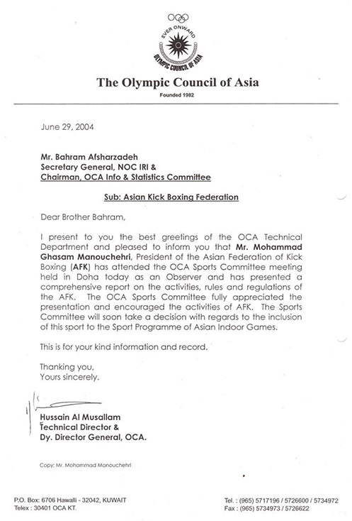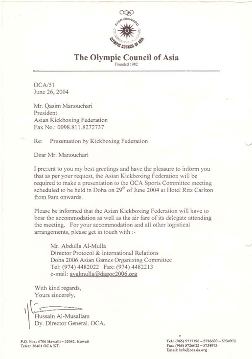 According to the Public Relations Department of the Asian Federation of Kickboxing (AFK), following prior coordination and the ongoing review of the Asian Kickboxing Federation’s case/file, Hussein Al-Musallam, Director General of the Olympic Council of Asia (OCA), officially, through letter No. OCA/51 dated June 26, 2004 (attached), invited Mohammad Ghasem Manouchehri, President of the Asian Kickboxing Federation, to attend a meeting of the OCA Sports Committee in order to introduce the of kickboxing Sport. The meeting was scheduled to be held at the Ritz-Carlton Hotel at exactly 9:00 a.m. on June 29, 2004.